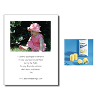 New Mom and Dad "Apology" NotecardsOUR ORIGINAL CREATION This is a fun and practical way to introduce your cute little baby to new people in crowded places. These notecards can be taken anywhere with you. Place a pre-packaged notecard with ear plugs on the seat of the stranger (i.e., new friend). You will strike up conversation and open doors that normally wouldn't be opened. Set of (8) Personalized Notecards with (EPG 900) |