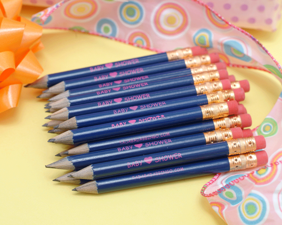 Baby Shower Pencils - Package of 25 baby shower pencils in dark blue with pink wording. Pencils say "Baby Shower" with a heart in the middle with "badabadabingo" on the reverse side. Perfect for playing shower games. Adorable! Need additional pencils? Sold in sets of 5. (PEN 300)