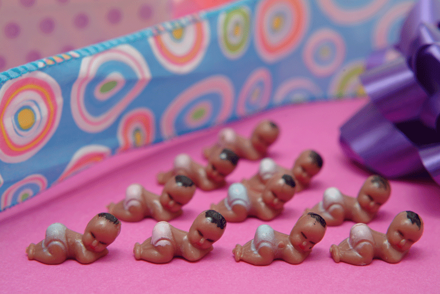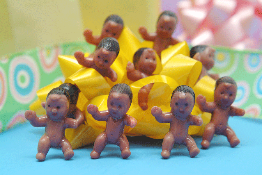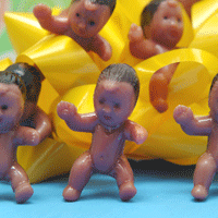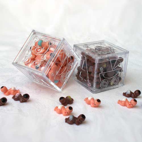 Count the Babies in the BLOCK!This is our version of a game that has been time-tested. The clear block shows a number of babies. Your guests may pick up the block, but not open the lid!! The one who guesses the exact number of babies will be awarded with a gift that you supply. We tie the block with a yellow, green or white satin ribbon (so no one will be tempted to peek!) -- Once the game is over, the new mom can keep the block to stow safety pins, paper clips, spare change or whatever! Cute, Cute, Cute!AFRICAN-AMERICAN (CBA 300) |