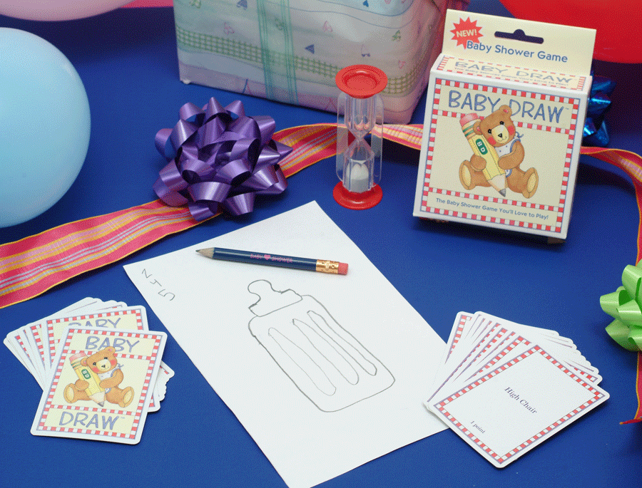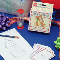 Draw it! Guess it! Score it! It's picture-charades for baby showers. Your guests will laugh and cheer as each team tries to score. All you need are pencil and paper -- we've done the rest. Can you draw crib? How about breast-feeding, pacifier or craving? Guess the pictures drawn by the artists on your team and score the points shown on the card. It's that easy! Play as long as you like. You set the limits. Baby Draw is for 4 or more players and comes with more than 100 cards. Deck of cards, plastic coated, instructions and a timer included. Reuse this game for many showers! Share it with friends. Help educate the expectant mother! (BDW 300) top |