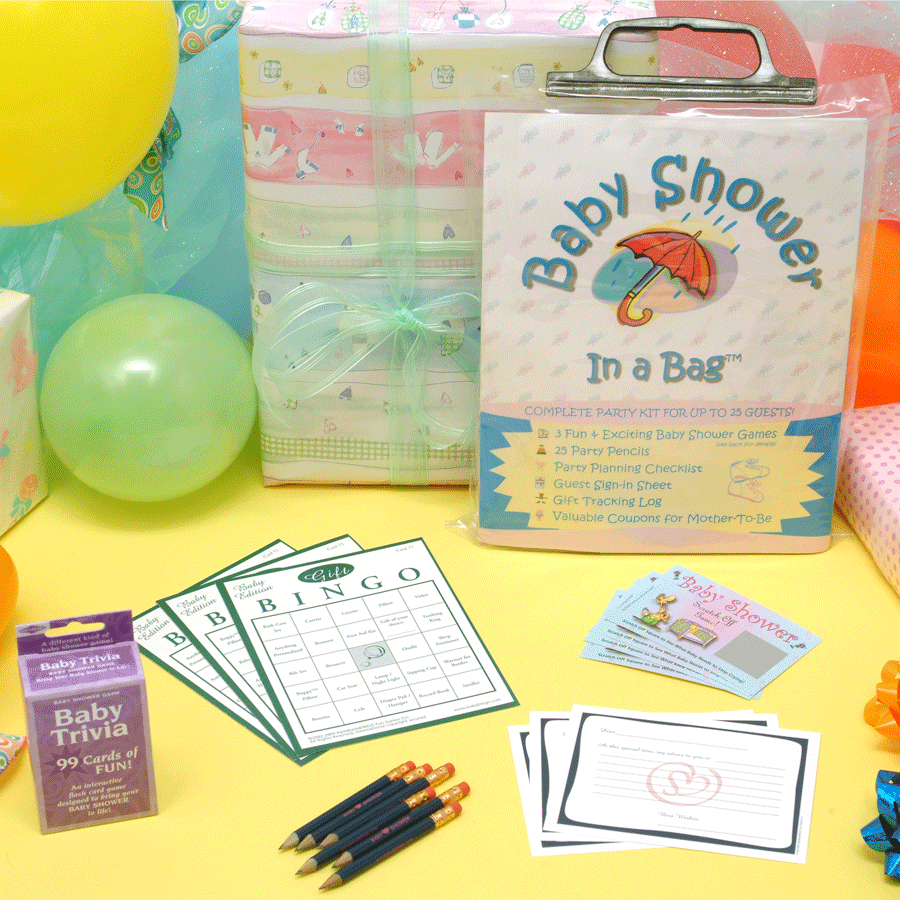 DISCOUNTED SPECIALS!! FABULOUS DEAL FOR 25 GUESTS!! Baby Shower in a Bag Kit #1 includes: 25 Pencils (6.95 value) Baby Shower Scratch Off Game (14.95 value) Gift Bingo (25 cards) (value 9.95) Baby Trivia (15.95 value) Keepsake: (25) Notes of Advice (7.45 value)