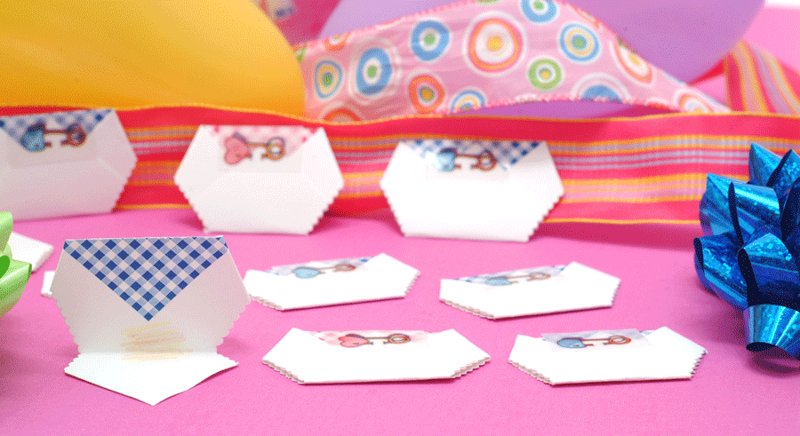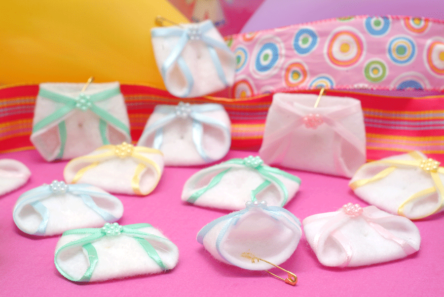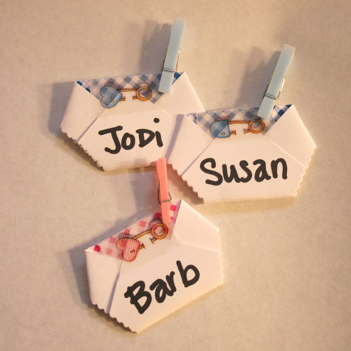 Note: Safety pins or double stick tape not included.) You can use the tiny clothespins (sold separately, shown directly below) to attach to clothing. Each diaper is hand made from nice card stock with a printed pattern, trimmed and is closed with a diaper pin sticker. |
