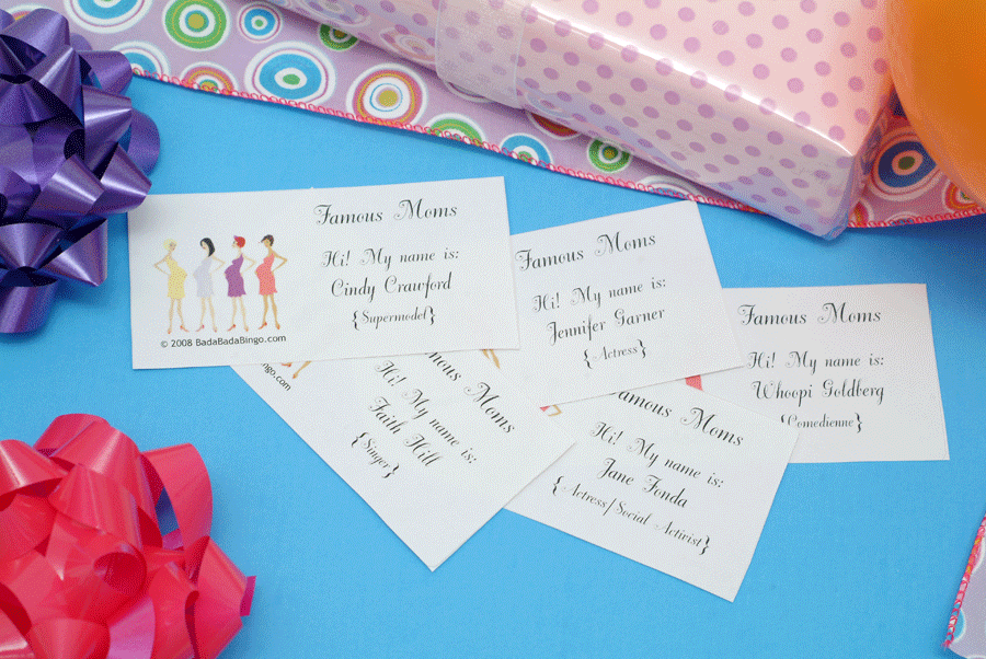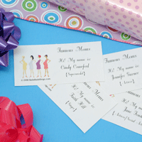Famous Moms Icebreaker Game This is the perfect ice-breaker game! No more "Shy Nancys." No way! Attractively priced, too! How to play: Upon arrival, place one "name tag" on each guest's back. She is to guess which Famous Mom she has been assigned. She is allowed to ask any other guest three "yes" or "no" questions such as "Am I alive?" "Am I blonde?" "Do I act?" etc. She is not allowed to peek in the mirror to read the answer! The object: To be the first to guess which Famous Mom she is. Initial set comes with (40) unique Famous Moms. You can order additional sets of (10) unique Famous Moms Names up to (80). Famous Moms (FMG 300) |