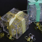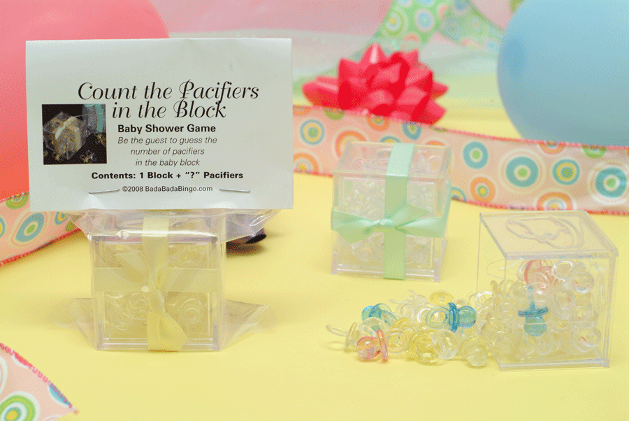 Count the Pacifiers in the BLOCK!This is our version of a game that has been time-tested. The clear block shows a number of pacifiers. Your guests may pick up the block, but not open the lid!! The one who guesses the exact number of pacifiers will be awarded with a gift that you supply. We tie the block with a yellow, green or white satin ribbon (so no one will be tempted to peek!) -- Once the game is over, the new mom can keep the block to stow safety pins, paper clips, spare change or whatever! Cute, Cute, Cute! Yellow (CPK 300) |