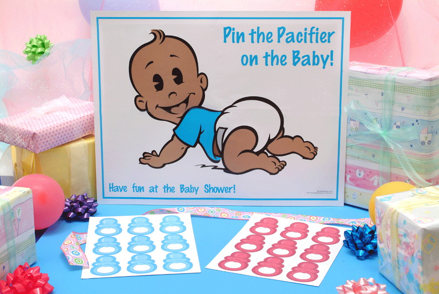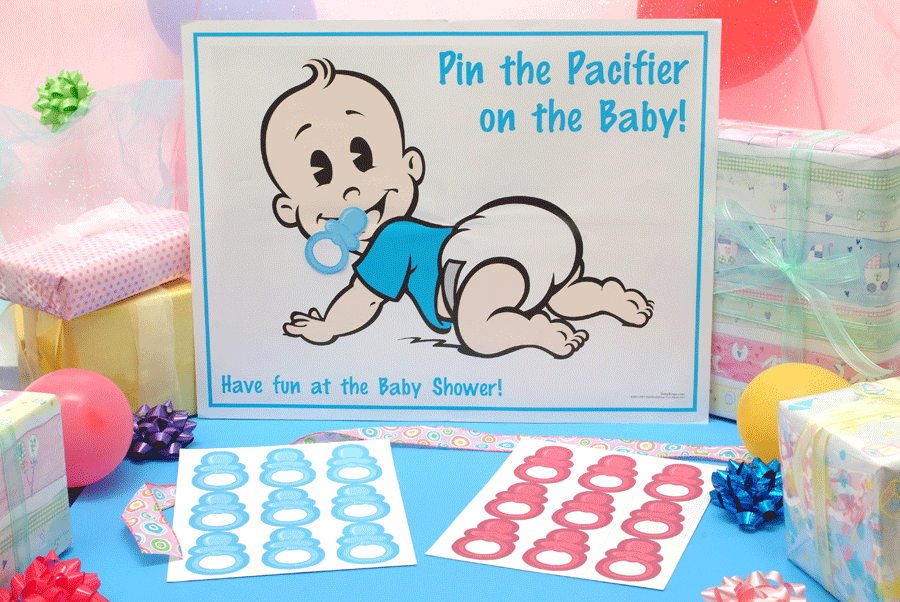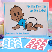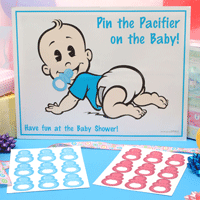 This is a new twist on a classic favorite! Everyone has played "Pin the Tail on the Donkey" before! Each guest is blindfolded one at a time, is twirled around and gets their chance at making sure the pacifier gets in the right place!! The pacifier that is closest to the baby's mouth wins! Be sure to get your camera out, this is hilarious!!Choose one of our four babies. If you're unsure of the baby's gender, choose the one you like best! Even the blue tops can double as girls...Please note: Tape is not supplied. You may use double stick or traditional scotch tape. Game comes complete with |