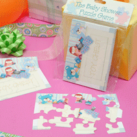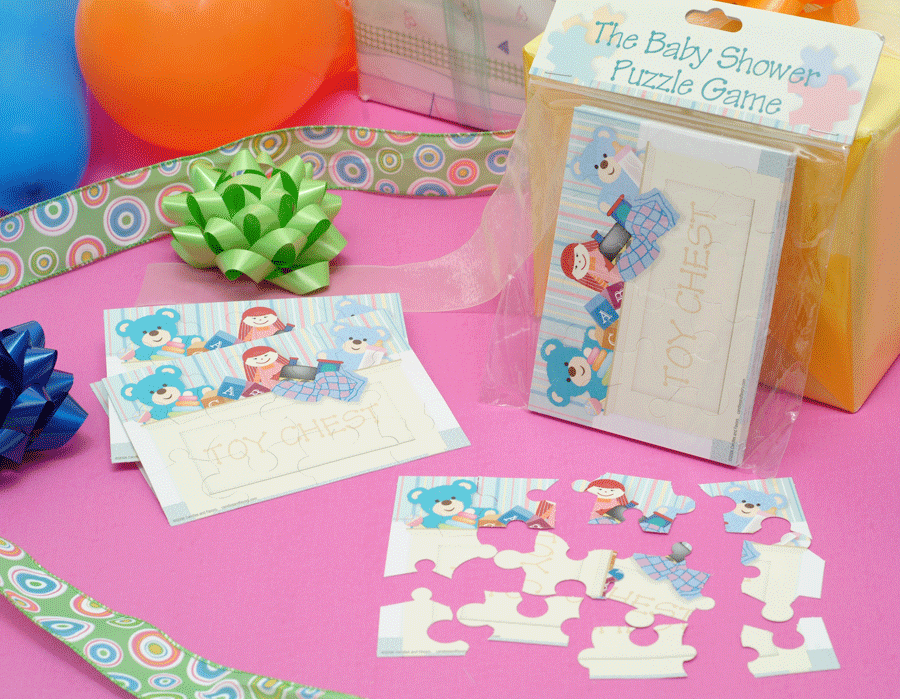 The Baby Shower Puzzle Game Entertain your guests with the newest baby shower game on the scene. Hand each guest a finished puzzle. Ask them to tear apart the pieces and mix them up. Your guests will race to reassemble the puzzle pieces to complete the TOY CHEST. The guest who finishes first wins.Each puzzle contains twelve (12) pieces. Each game comes complete with (20) puzzles per pack. You can re-use this game for many showers! (PZY 300) |