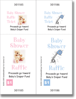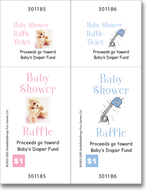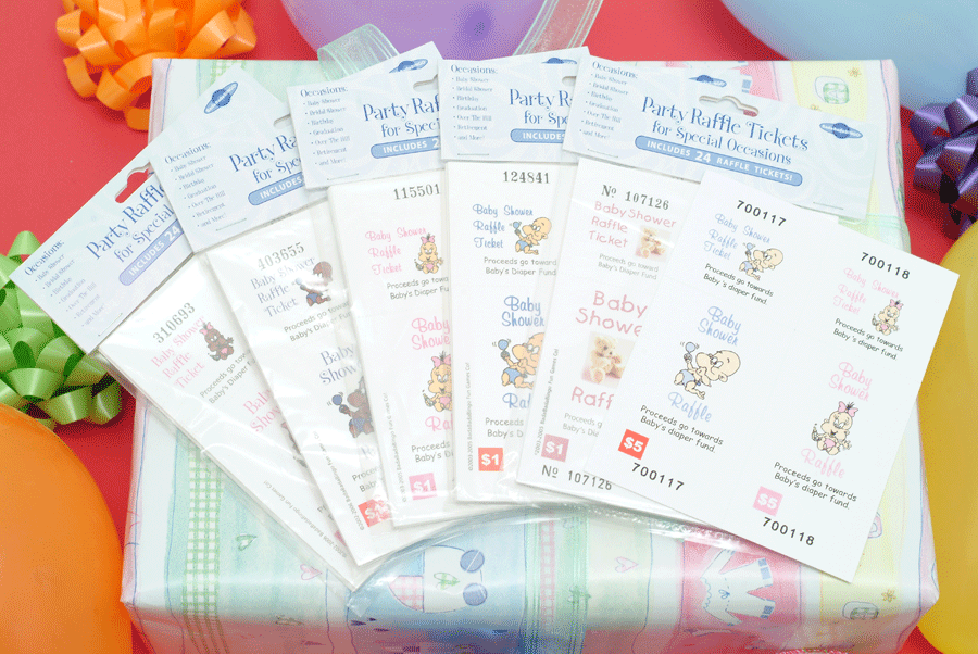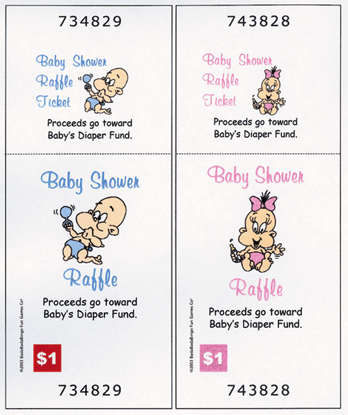 PERSONALIZED Baby Shower Raffle Tickets For that extra touch, personalize each raffle ticket with the baby's name and type of fund and amount (if desired). $5 per ticket is an ideal amount because the extra money can really help out the new parents. Or, just play for fun and give away a door prize. Everybody loves a raffle!!