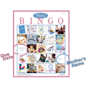 AN ORIGINAL BadaBadaBingo CREATION, We print the name of the mom and her due date on each card! Personalized Baby Bingo comes complete with instructions, colorful game cards printed on card stock along with 80 caller chips and a master caller sheet. Each name and date will appear in different places on the cards you order. NO TWO CARDS ALIKE. Personalized cards are approximately 5" x 6". Please note: Markers are not included (we recommend you use jelly bellys, m&ms, hershey's kisses, safety pins, or other forms of markers) (BYP 002) Minimum order is 30 cards. |