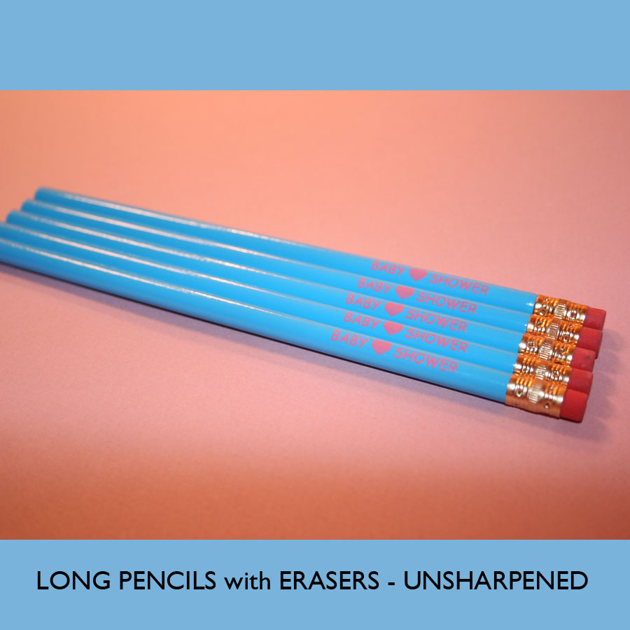 Baby Shower Pencils - FULL Size with Erasers (UN-sharpened) Package of 10 FULL SIZED baby shower pencils in pastel blue with pink wording. Pencils say "Baby Shower" with a heart in the middle with "badabadabingo" on the reverse side. Perfect for playing shower games. (PEN 320)