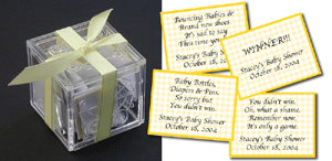 Bada Baby Block Game This is our answer to a Chinese Fortune Cookie! Bada's unique game has guests choosing baby shower-themed sayings from this adorable clear plastic block. The Mom-to-Be's name and shower date is printed on each slip to be drawn. If you'd like to save $3, choose to NOT Personalize, and receive the same game with 15 loser sayings and 1 winning saying. Your total will be just $6.95 for a unique fun game to play. Reusable or gift it to Mom-to-Be! QTY(1) for 1 block with 16 sayings, |