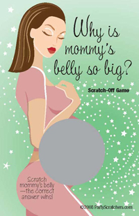MOMMY'S BIG BELLY AN ORIGINAL BadaBadaBingo CREATION, Who Will Get the Cute Baby?? Scratch Mommy's Tummy to see why she's so BIG!!! How to Play Preparation Time: IN STOCK!! If you have 40 guests and only want 1 winner, purchase two packs and simply remove the top card from one of the packs and shuffle all cards together. Order 2 sets and double your fun! (PSY 302) |