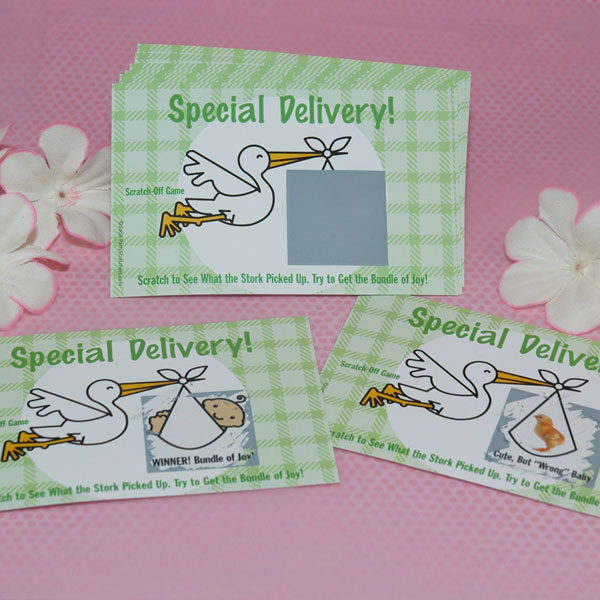 SPECIAL DELIVERY Baby Shower Scratch-Off Game by PartyScratchers™THE ORIGINAL BadaBadaBingo CREATION, Who Will Get the Bundle of Joy Scratch off the silver square to see what the Stork picked up today! How to Play Preparation Time: In stock! If you have 40 guests and only want 1 winner, purchase two packs and simply remove the top card from one of the packs and shuffle all cards together. Order 2 sets and double your fun! |