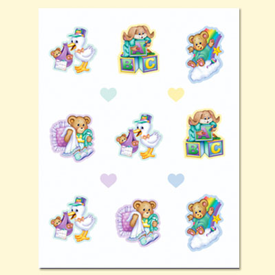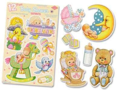 | Twelve (12) Baby Shower Cutouts, Caucasian Twelve (12) Baby Shower Cutouts include baby bird, rocking horse, baby in a bath, diaper pin, rattle, baby bird, cradle, blocks, baby bottle, baby in a moon, teddy bear and a carriage. (BCC 602) |