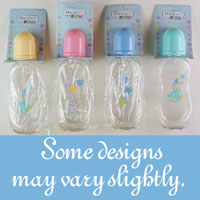 A perfect baby shower favor. Use these non-filled baby bottles and fill them with your favorite items - jellybeans, m&ms, potpourri, etc. Place them next to place settings or hand them out in a gift basket. IDEA! Play "Guess How Many Jelly Beans are in the Baby Bottle" ~ Mom gets to take home a real working baby bottle after the shower. Each bottle stands approximately 9" tall. Your choice of top color. Designs may vary slightly, but they generally come with cute teddy bear, clowns with balloons or stars. PINK (BTP 609) |