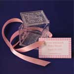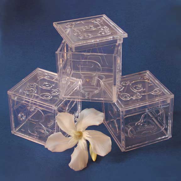 Fillable Baby Blocks (2")Our acrylic blocks are 2" square and are able to act as a holder for buttons, spare change, safety pins, etc. The lid opens easily to fill with fun items. Decorate as desired and wrap with your favorite bow. Attach a personalized tag and you have a wonderful baby shower favor as a takehome memory for your guests! BLK 600 |