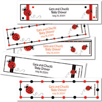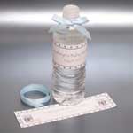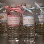 Who doesn't enjoy the refreshing taste of bottled water? Here's a unique way to personalize each bottle to your baby shower - We supply the labels and the ribbon - you assemble! It's that simple. Your choice of gingham pattern color and bow color. Have one for each guest or one for each table. They make a lovely presentation. Water bottles not included. Some assembly required. Choose among options below. We have matching options to the candy bar wrappers above as well. Click on the images to see a larger view. 4 sets minimum (WBL 600) Label with matching ribbon - water bottles not included |