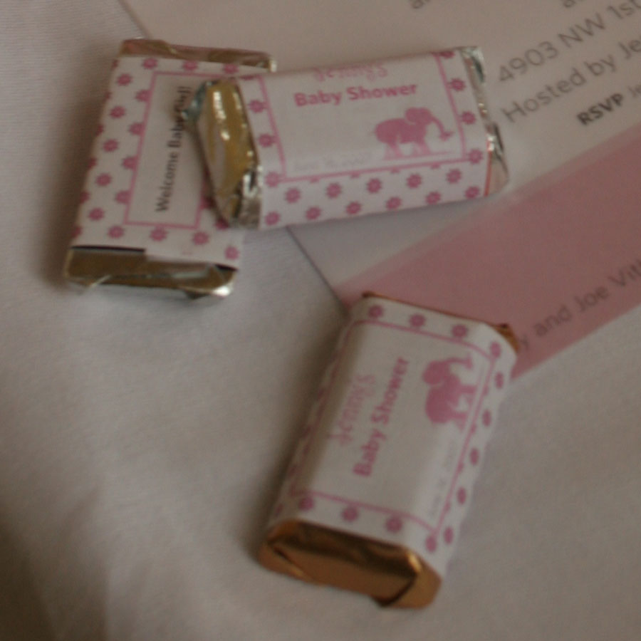 Personalized Candy Bar Wrappers - Elephant w/Flowers in Pink DesignThese labels are self-adhesive and cover the Hershey's Miniature Chocolates. Shown here is the "Elephant w/Flowers in Pink " themed design. See our themed page for more on this design! Have a special design in mind? Just ask our Graphics Department! Minimum 4 sets of 15 wrapper favors. CHOCOLATE NOT INCLUDED. (CWM 303) |